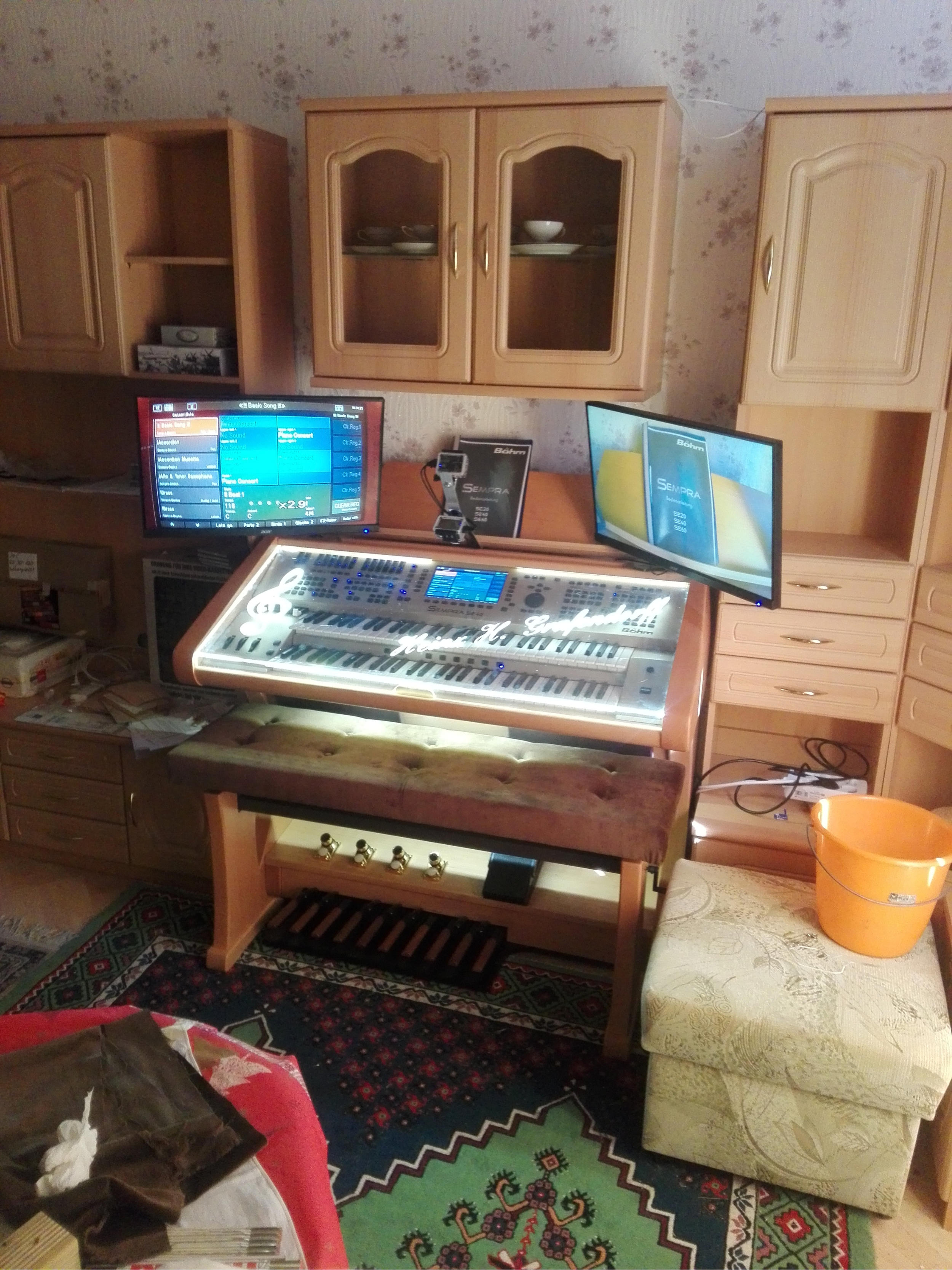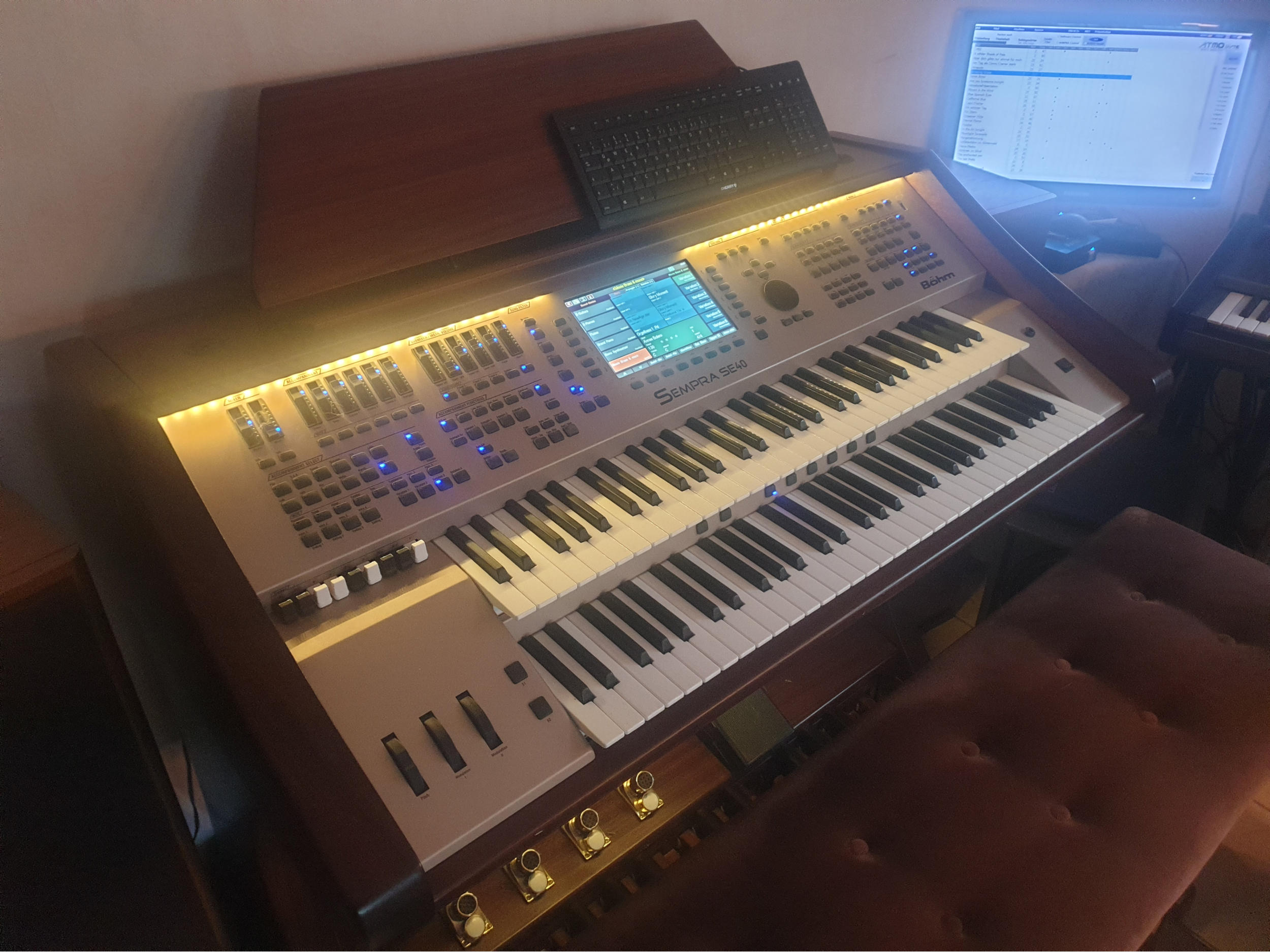 Zur Zeit baue ich auf Kundenwunsch ein großes Notenpult/Notenbrett für eine umgerüsteteSEMPRA SE 60, welches auch eine von der SEMPRA angebotene Dimmung der Bedienfeldbeleuchtung beinhaltet. Dieses Pult wird mit einer TV-Wandhalterung bis nach vorne über das Bedienfeld gezogen und kannbis zu vier DinA 4-Seiten nebeneinander an Noten tragen.Die LED-Stripes werden richtig eingeklebt, wenn die endgültige Farbgebung fertig istHier gibt es vor weg die ersten Bilder davon!Übrigens: Diese Orgel steht zum Verkauf!
