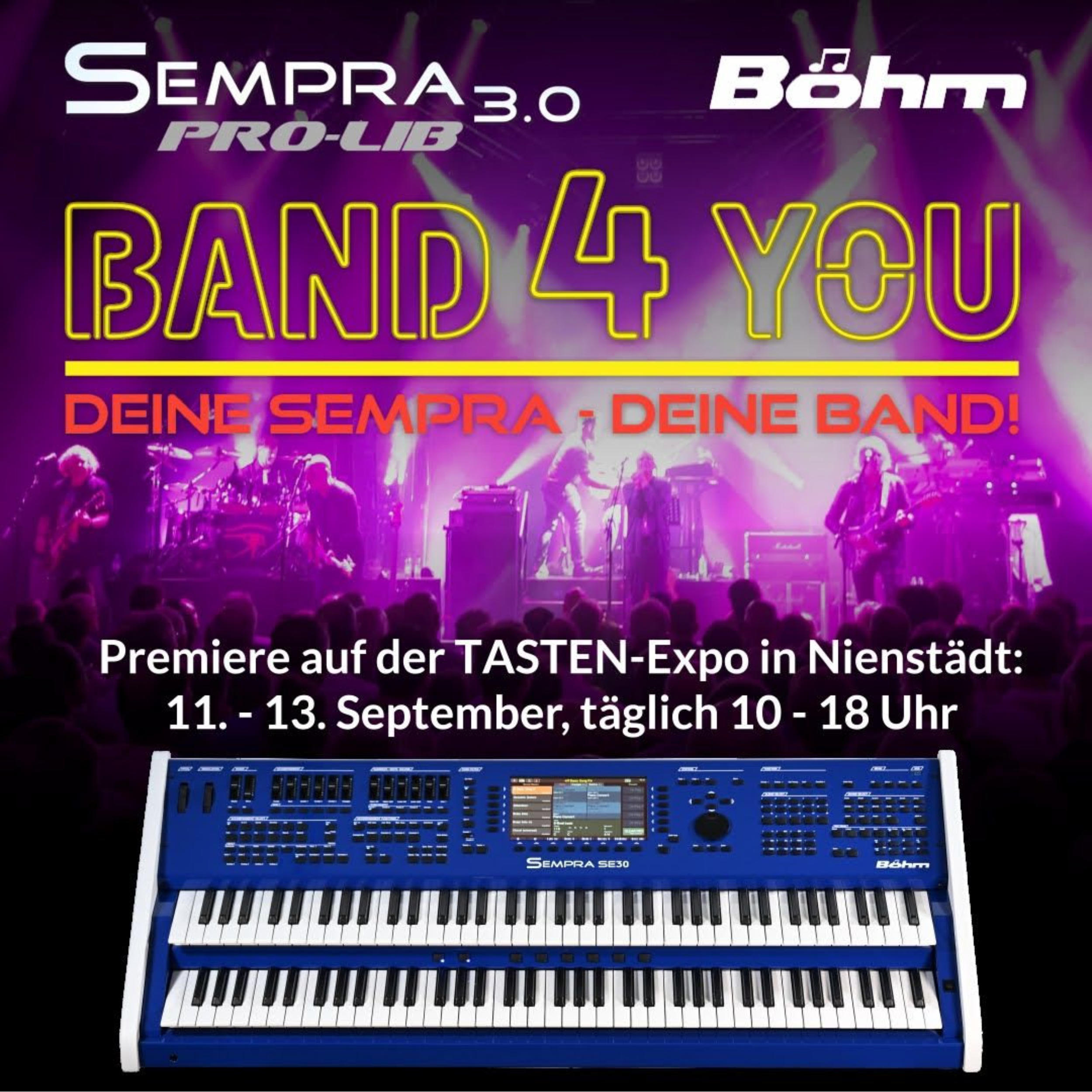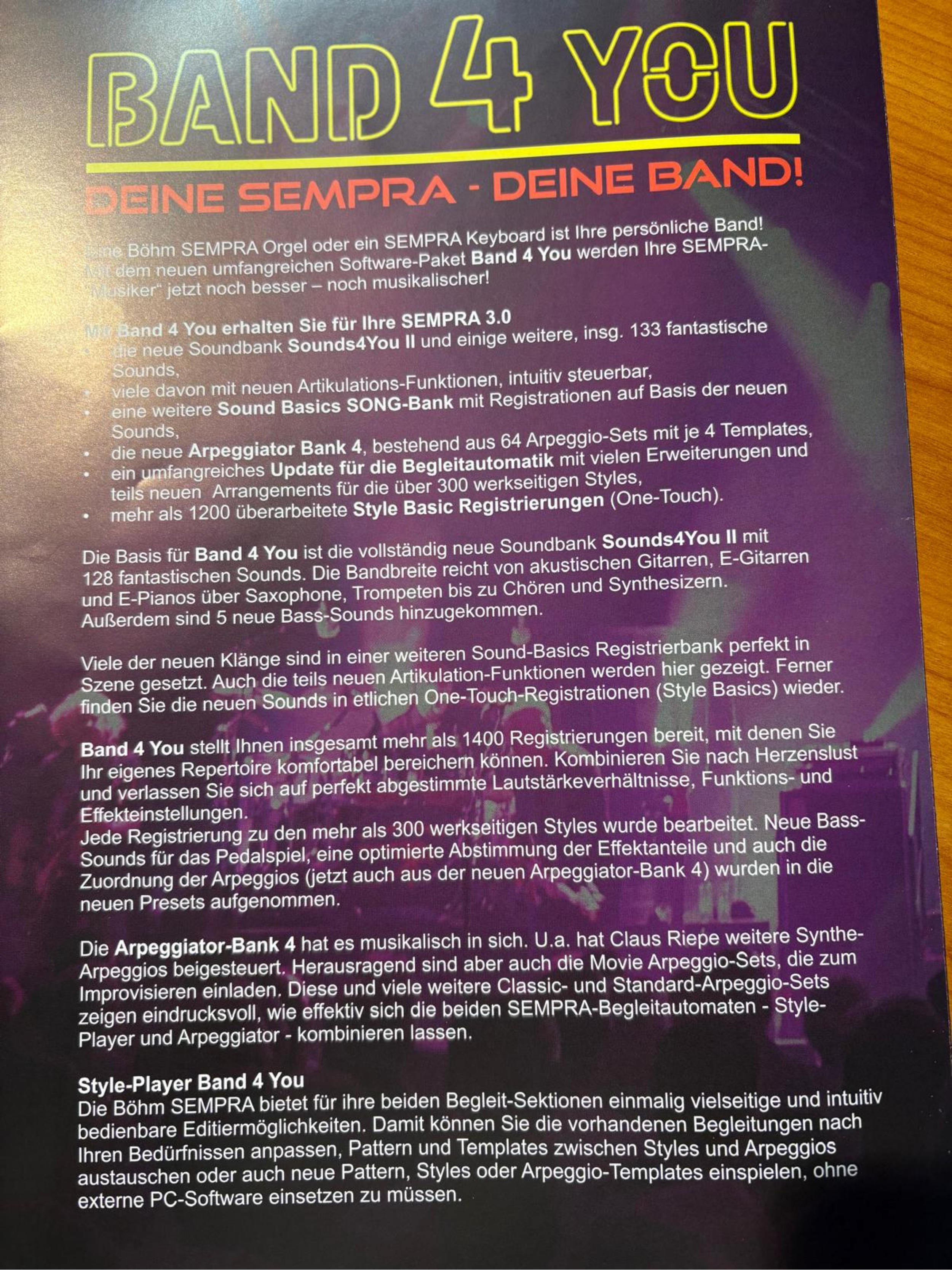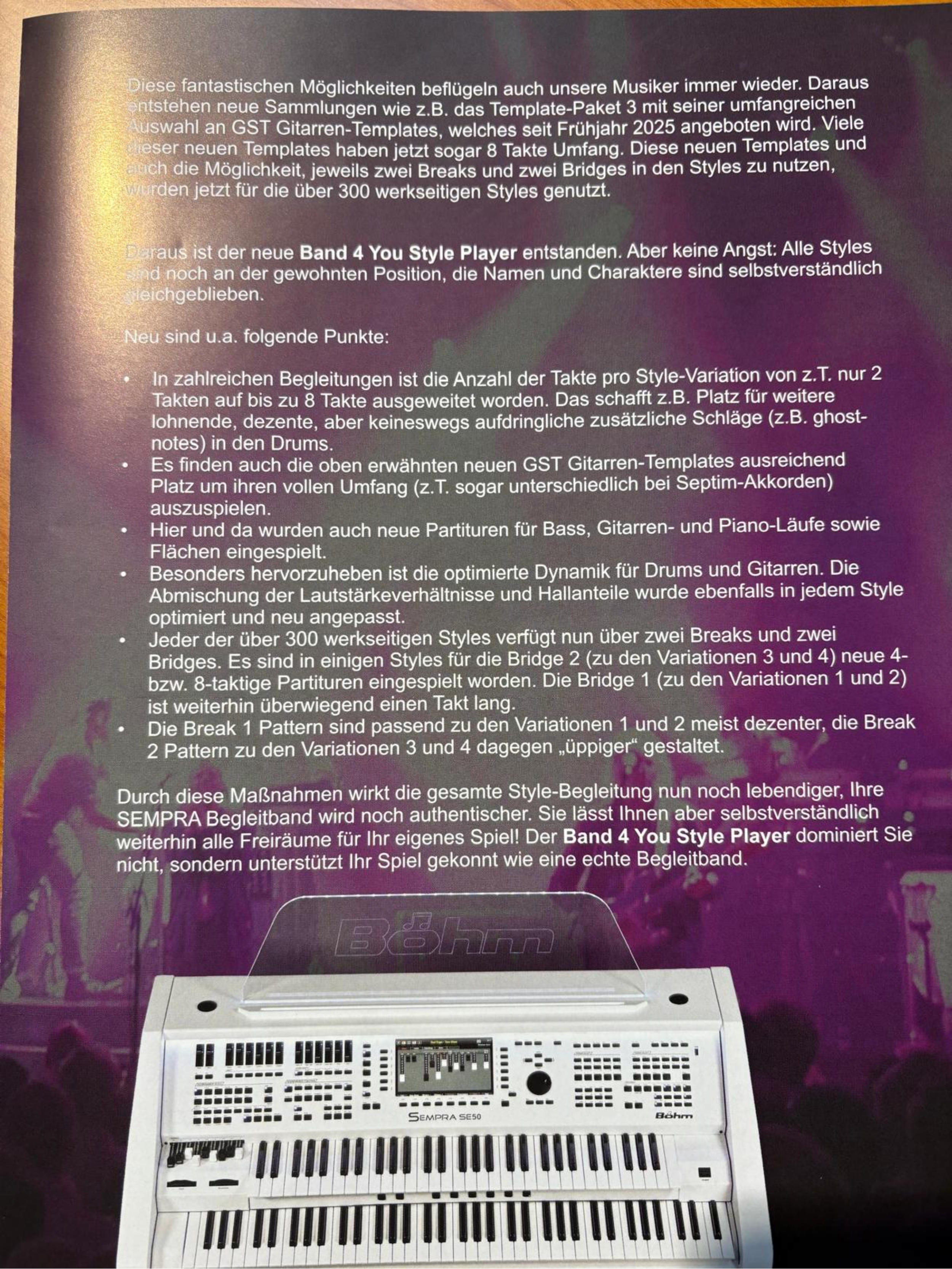 Das neue SEMPRA 3.0 hat alle Besucher der Hausmesse bis ins Mark beeindruckt. Die SEMPRA-Serie bekommt ein neues Betriebssystem mit dem Namen „3.0 ProLib“.(Professional Library), Dieses umfaßt u.a. folgende Neuigkeiten-- Soundpaket mit weiteren 400 Sounds-- Zusätzliche Drumkits-- Erweiterungen in den Werksdaten eingearbeitet-- Neue SoloChord-Funktion (Ensemble)-- Neuer Audio-Parameter „Ambience“-- Programmierbare Tempoänderungen-- Speichererweiterung im User- und Firmbereich-- Anzahl der Taster-Makros auf 300 erhöht