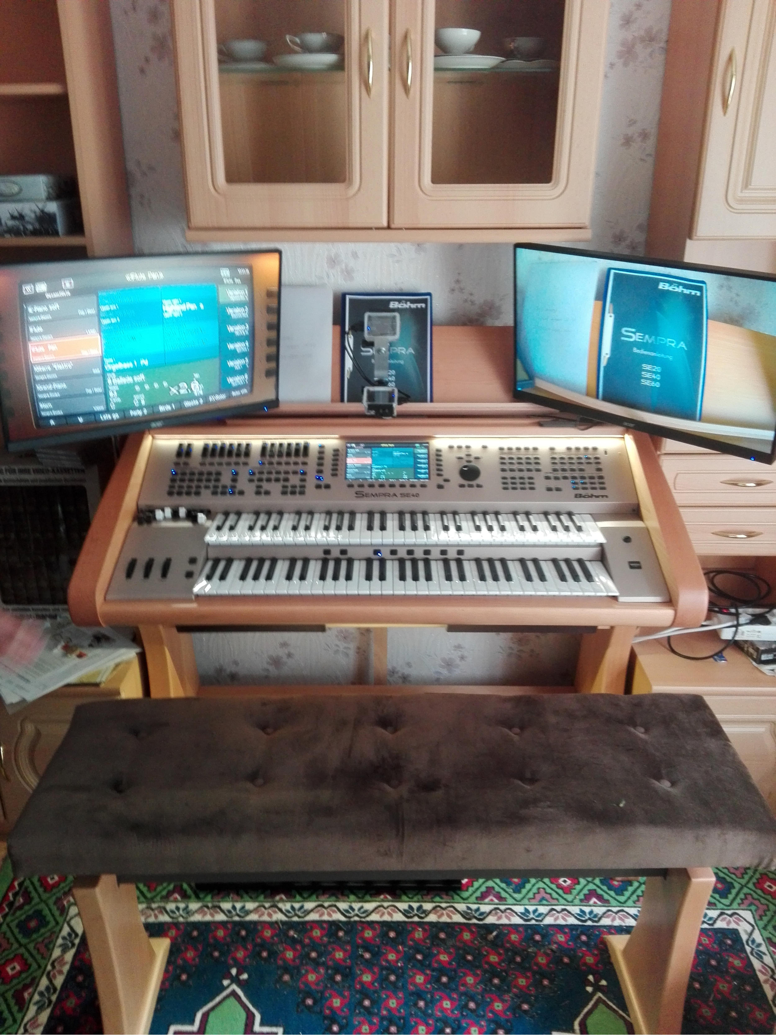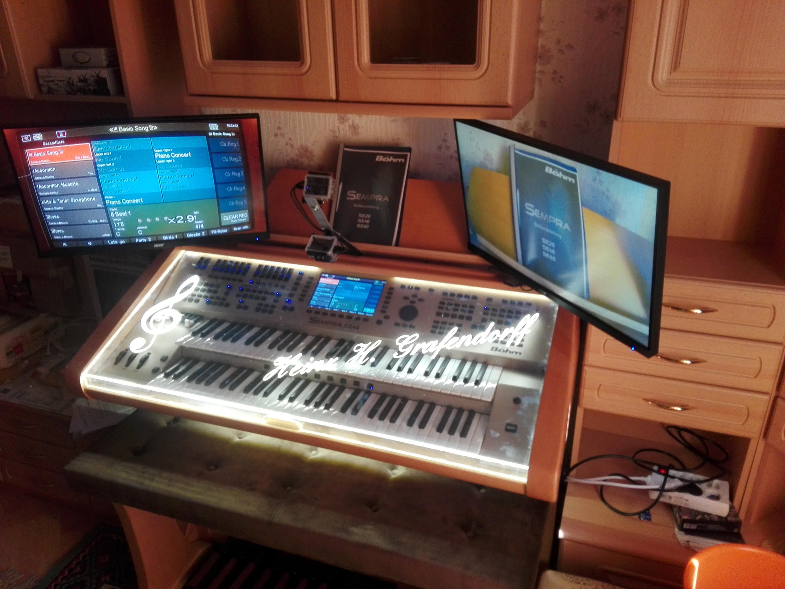 Ein ganz spezieller Wunsch wurde einem Kunden erfüllt, der leider unter einer Makula-Degeneration litt und inzwischen verstorben ist. Er hatte mir aber damals eine Genehmigung zum Zeigen der Bilder gegeben. Er bekam eine SEMPRA SE 40 in Buche Massiv mit speziellenSeitenwangen, die es ermöglichten, eine Acryl-Abdeckung mit eingefrästen Motiven und eigenem Namen (!!) aufzulegen. Zudem habe ich zwei 27-Zoll-Monitore mit Action-Cams angeschlossen und befestigt, die das Orgeldisplay und die Noten extrem vergrößert dargestellt haben.