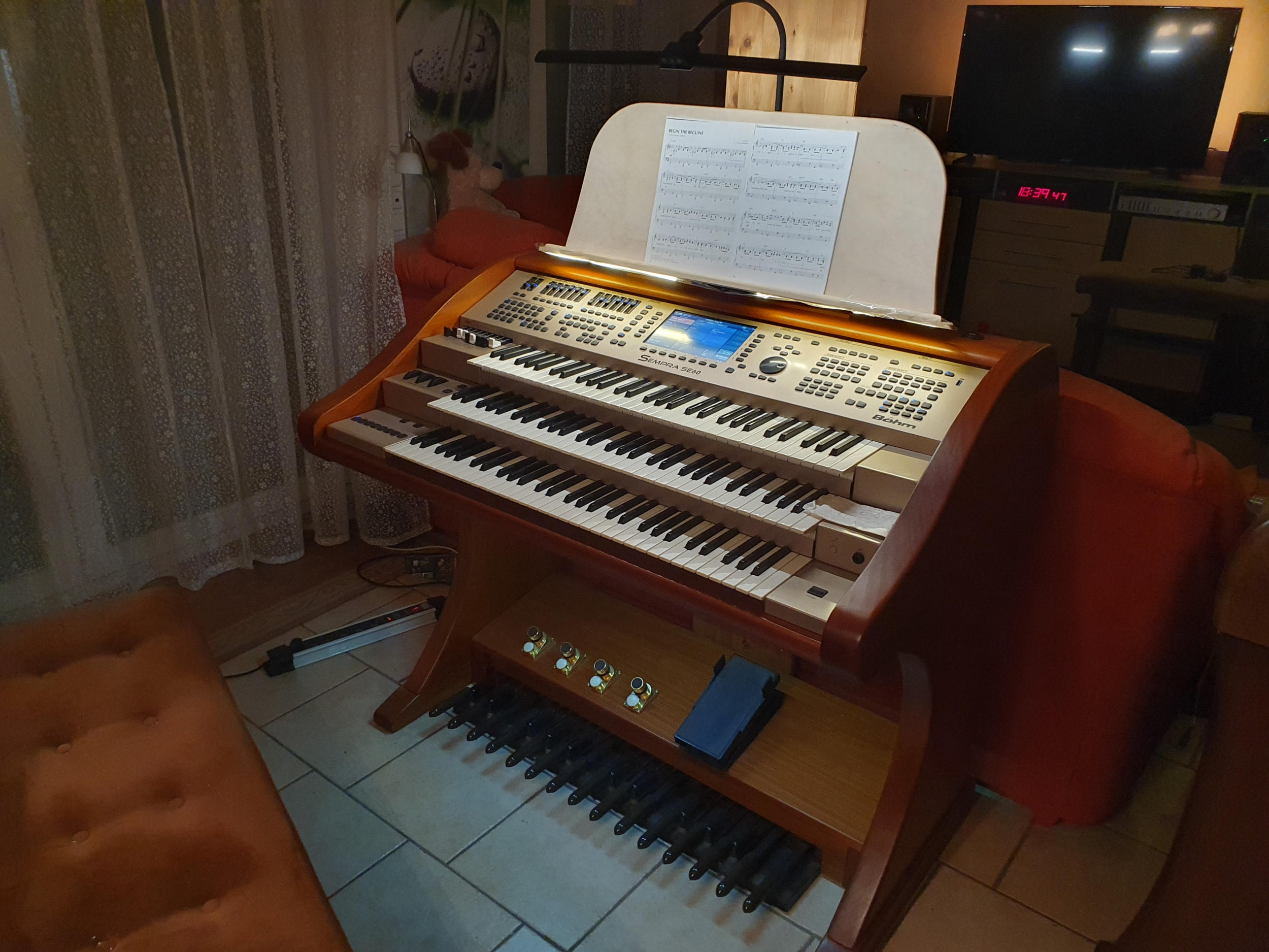 Zur Zeit baue ich auf Kundenwunsch ein großes Notenpult/Notenbrett für eine umgerüsteteSEMPRA SE 60, welches auch eine von der SEMPRA angebotene Dimmung der Bedienfeldbeleuchtung beinhaltet. Dieses Pult wird mit einer TV-Wandhalterung bis nach vorne über das Bedienfeld gezogen und kannbis zu vier DinA 4-Seiten nebeneinander an Noten tragen.Die LED-Stripes werden richtig eingeklebt, wenn die endgültige Farbgebung fertig istHier gibt es vor weg die ersten Bilder davon!Übrigens: Diese Orgel steht zum Verkauf!